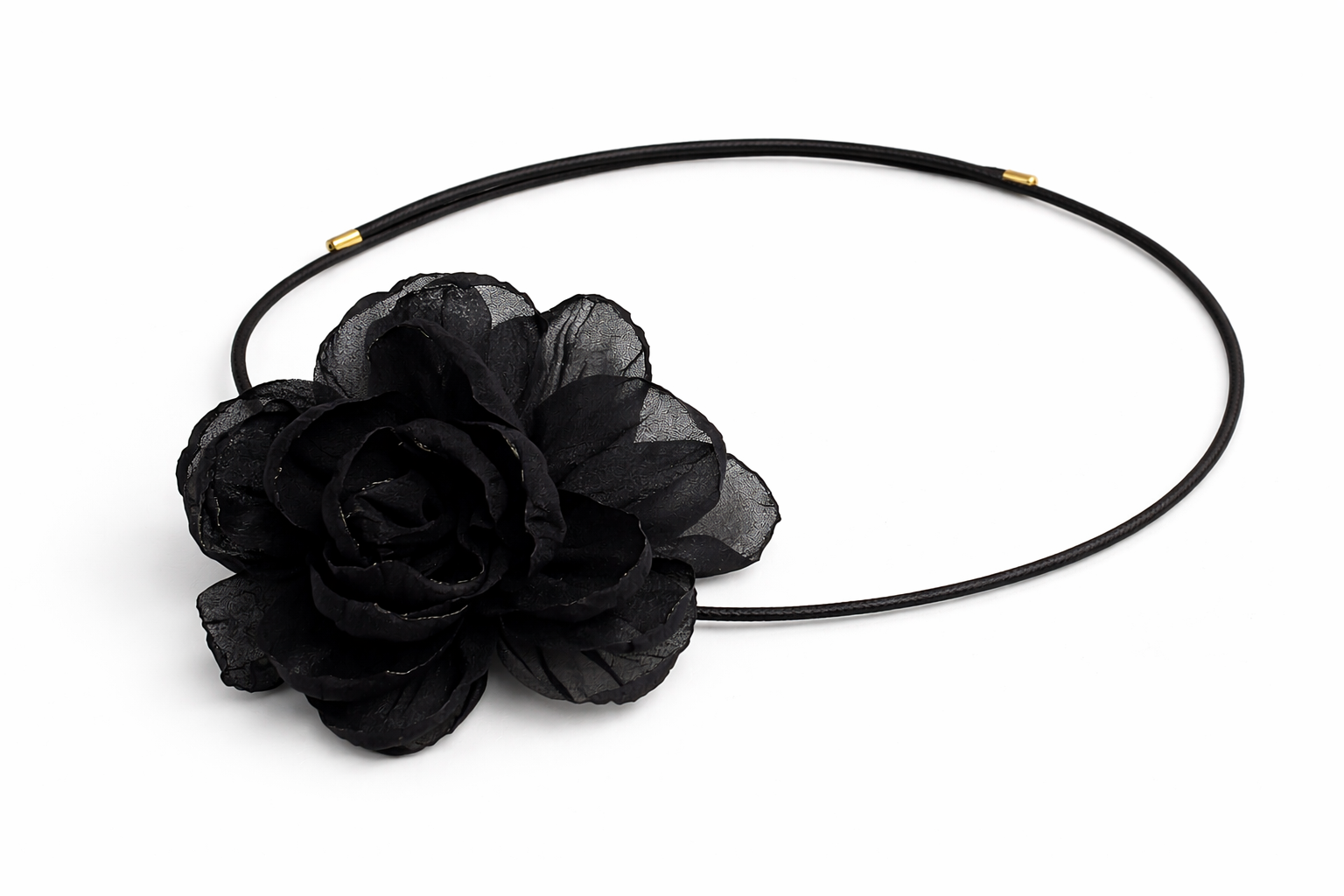 Precioso collar tipo choker, con diseño de flor de gasa negra y bordes quemados. El collar tiene iman lo que permite que su diámetro sea adaptable y se pueda usar también como pulsera , una maravilla dos en uno!