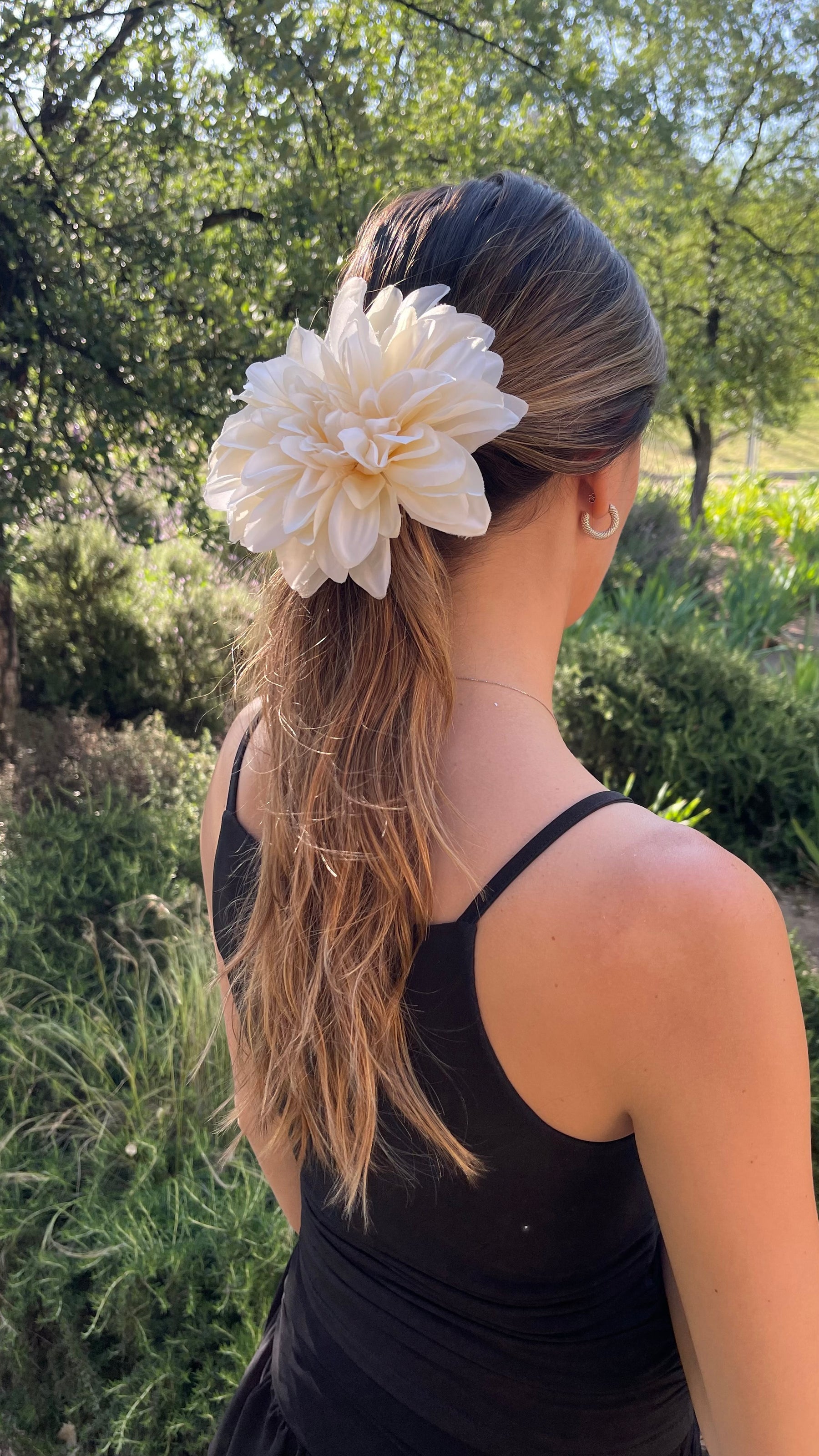 Linda traba de estructura francesa de 10 cms. de largo, calidad superior , fuerte agarre y aplicación de flor de genero de 15 cms. de diámetro aproximado.
